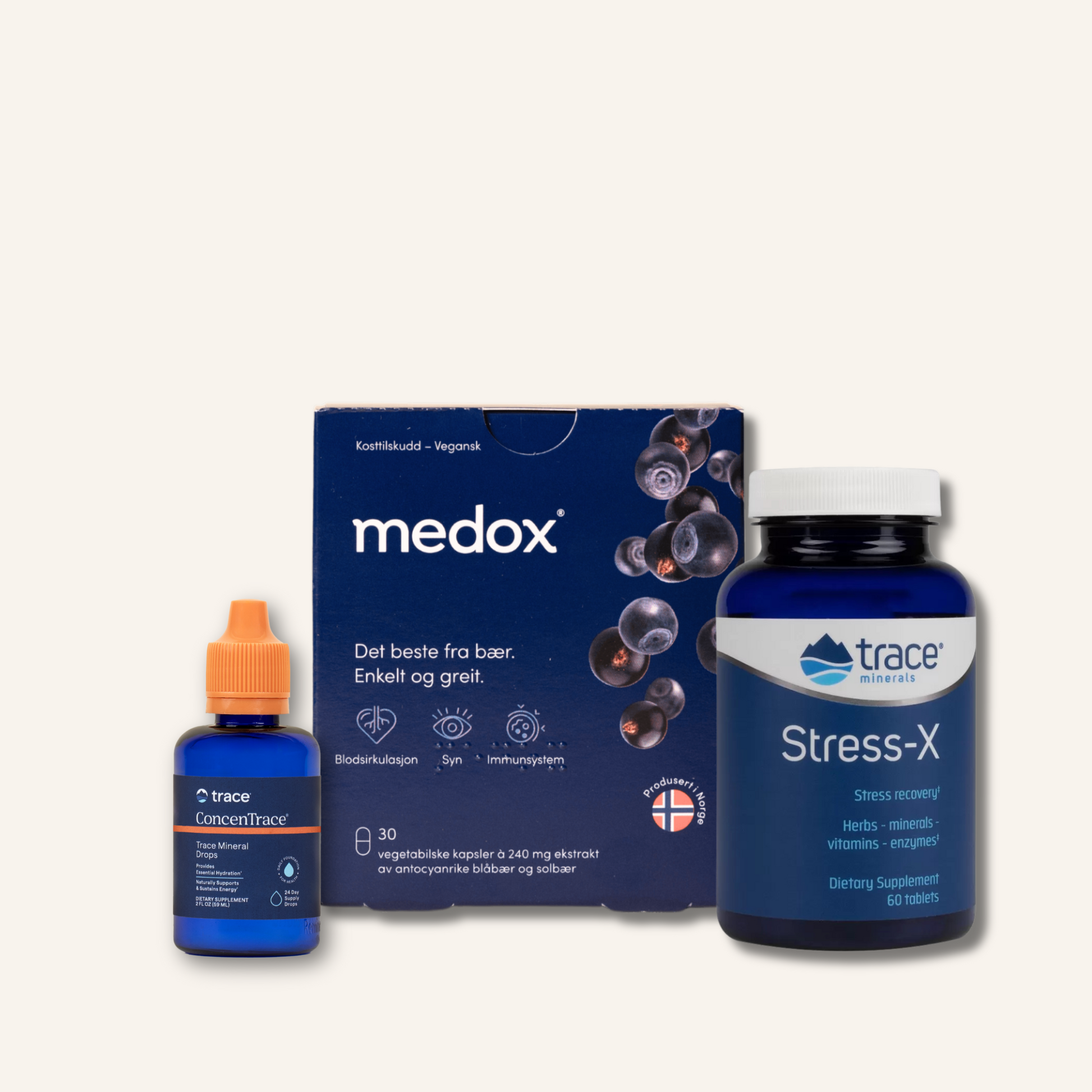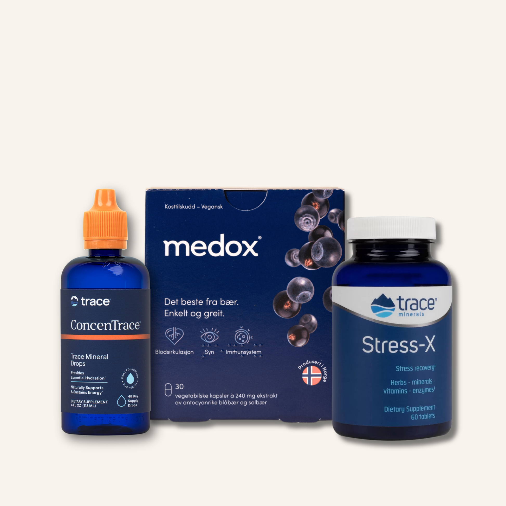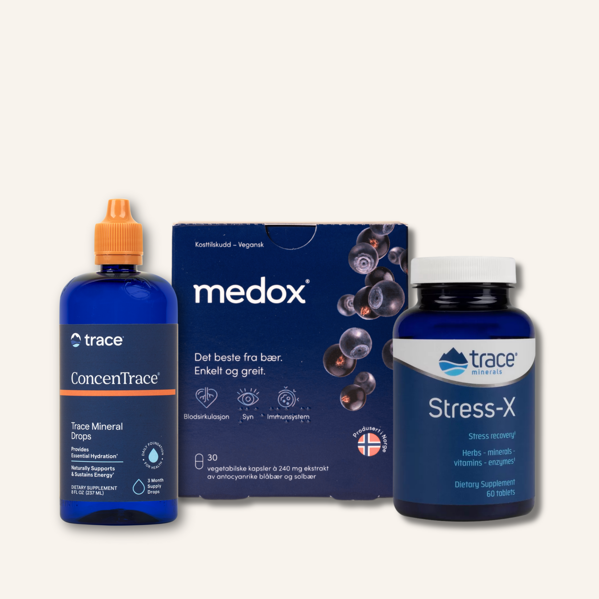 Uztura bagātinātāju TRIO – ConcenTrace Ionic Sea Minerals, Medox un Stress-X – nodrošinās, ka organismam netrūkst enerģijas un labsajūtas nodrošināšanai nepieciešamo vitamīnu, minerālvielu un antioksidantu!